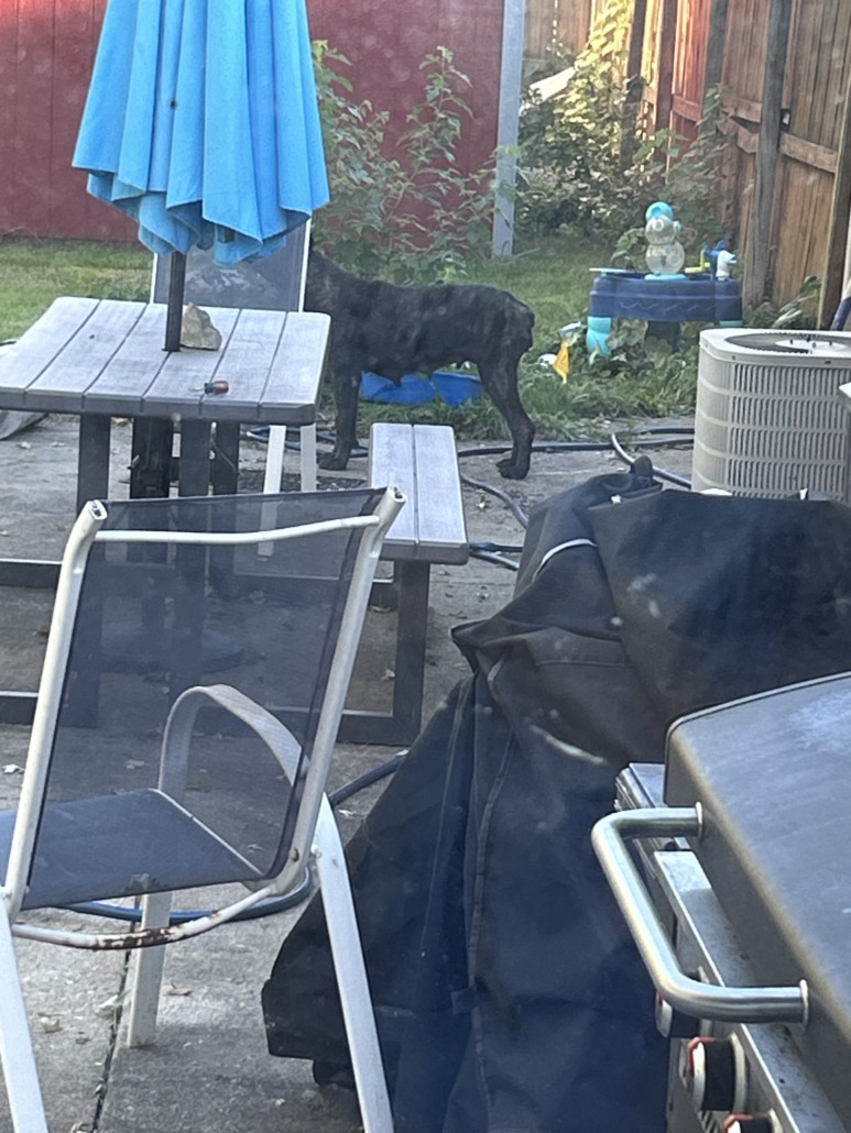 Female cane corso dog, recently has had pups as looks like she has been nursing. Found Eastside Indy. She has hunkered down in our backyard.