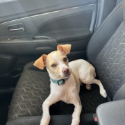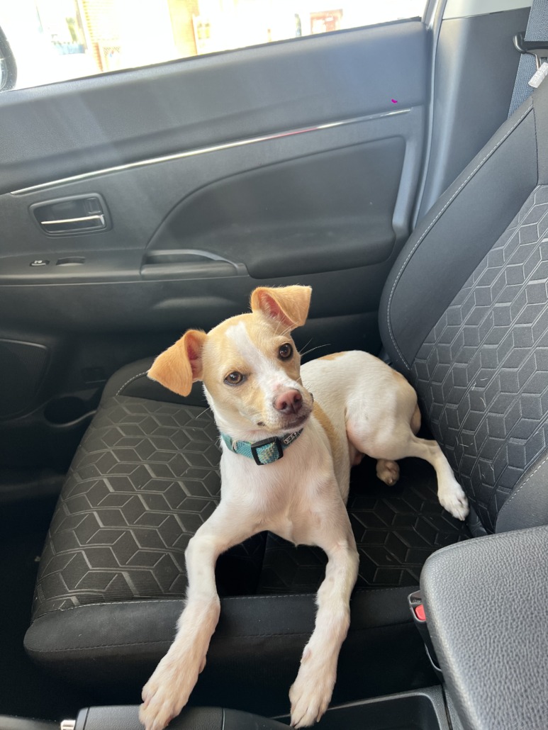 Small dog male. White with tan spots. Calm dog.