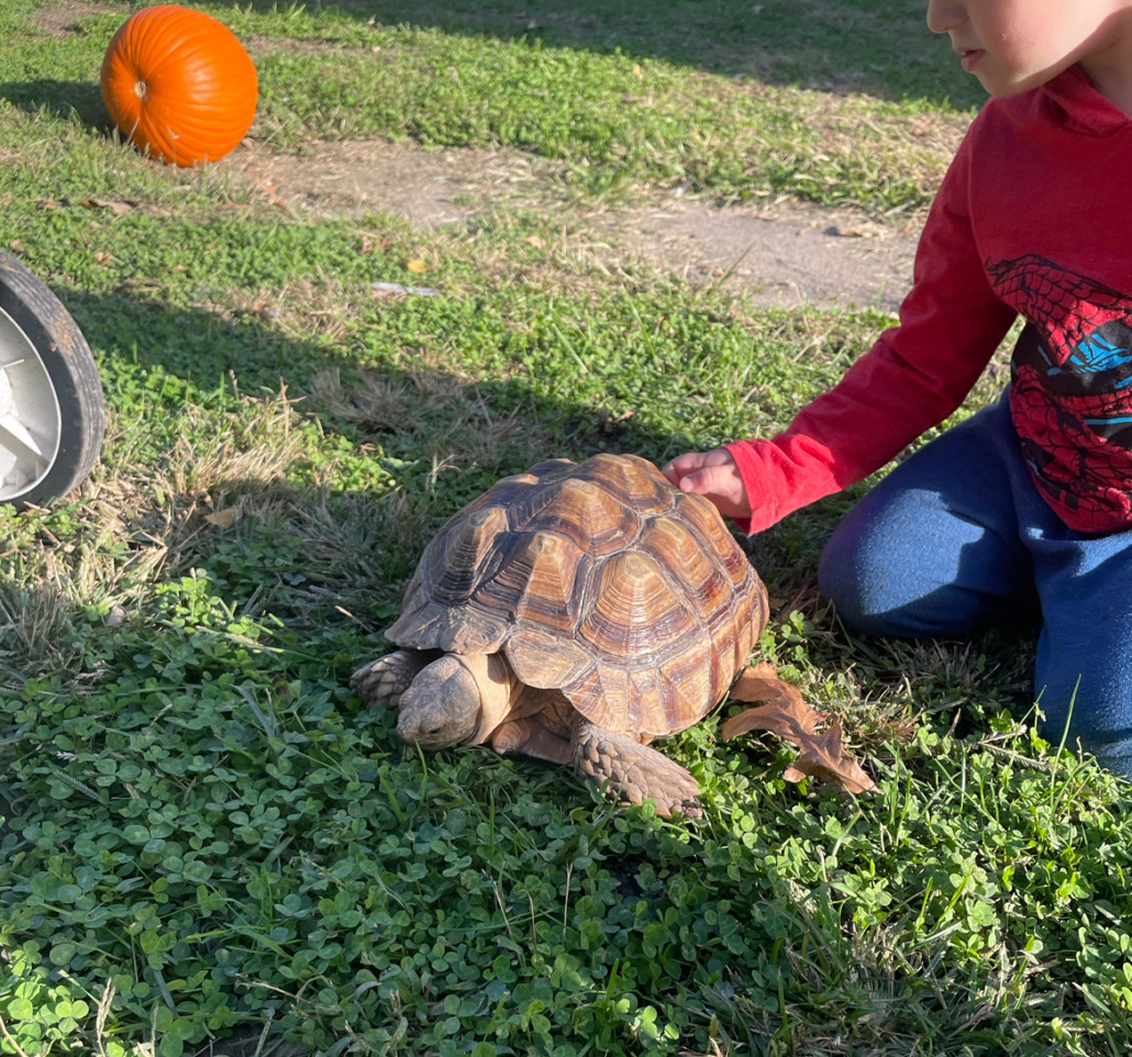 Rain is a 20-30 pound tortoise she’s very friendly. Shes most likely hiding in someone’s bushes/tall grass when it gets cold