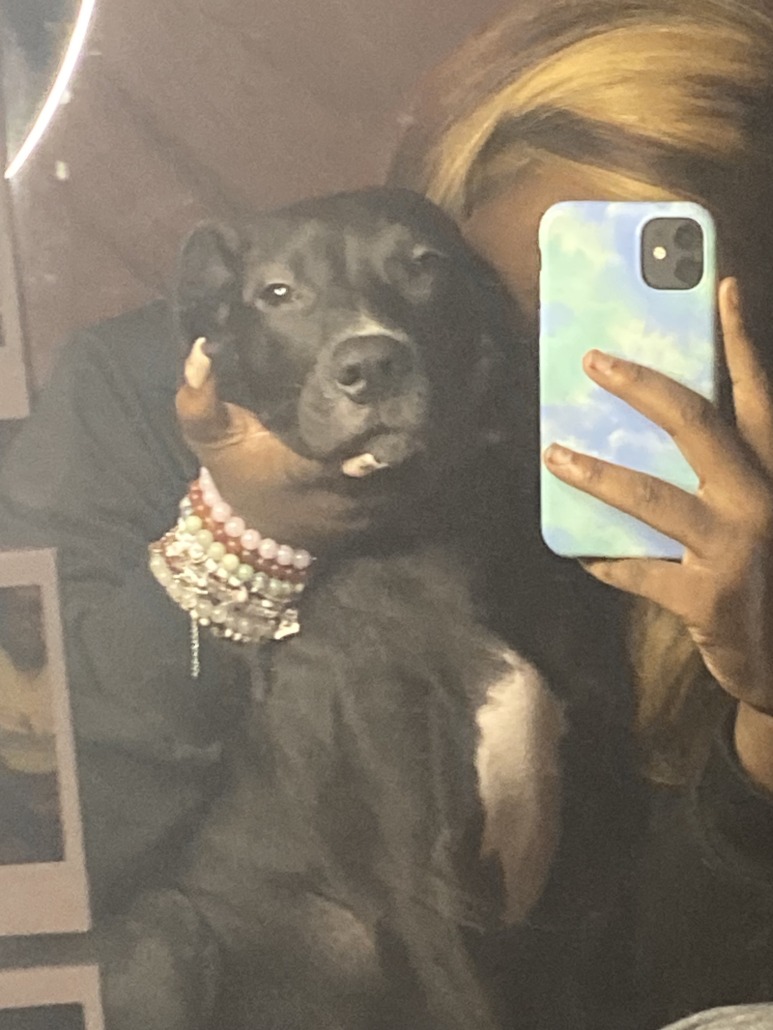 He’s an all black pit n chocolate lab mix with little white hairs on his back. He’s just 6 months old it’s been 2 days