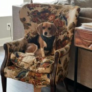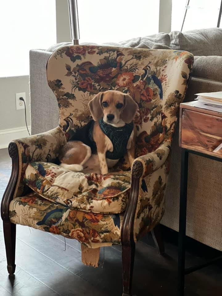 Small female beagle. About 29-30 lbs. black and teal harness. Bent tail.