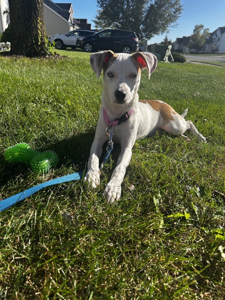 Small white dog with brown and black brindle spots. She is 4 or 5 months old with blue eyes. Proof of ownership is required