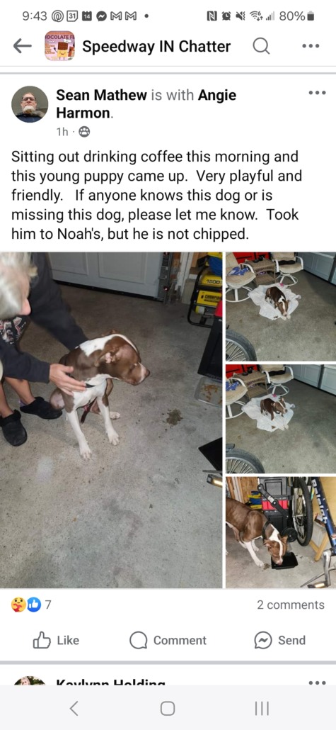 Very sweet male (intact). Tan and white. 1-2 years old, has a collar, but no tags and is not chipped. Knows some basic commands and responds well! Found in Old Speedway, Westside.