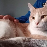 White with tabby spots. Will come if you have food or treats. He knows his name.