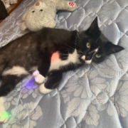 Oreo is a skinny black and white cat. She is missing some fur on her lower half. She is skittish so I am unsure if someone would be able to catch her. Maybe if someone opened a can of food or shook a bag of treats. Please let me know if you find/see her! 317-835-3766