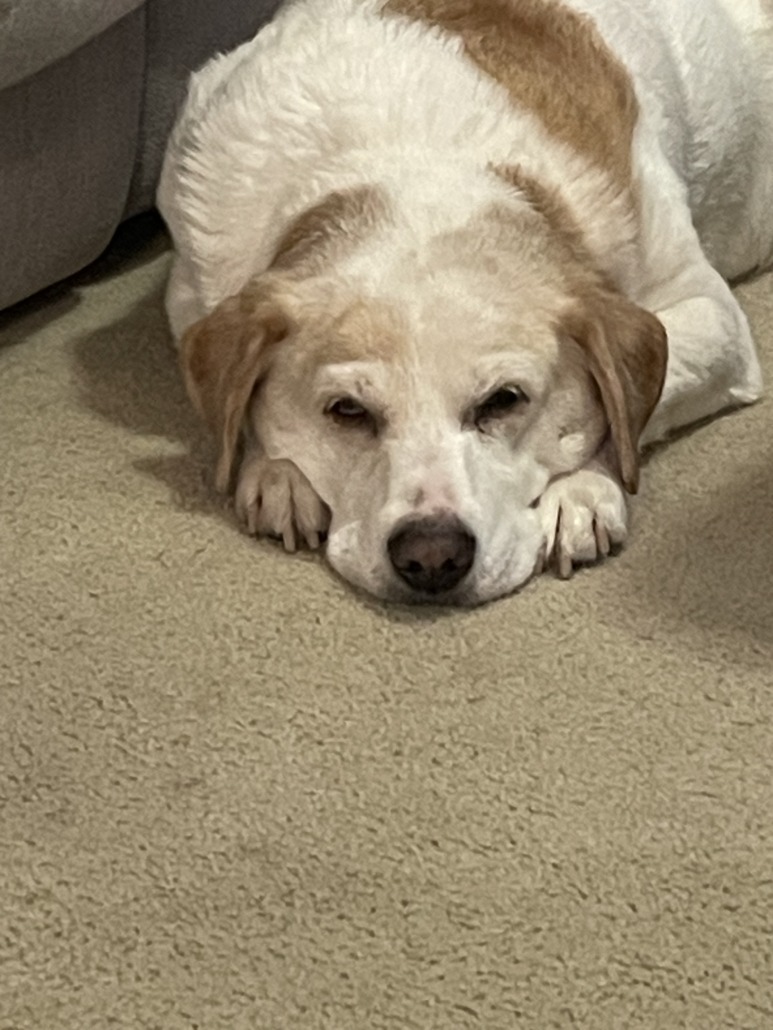 Large white and tan lab mix. Approx 60 pounds. Almost blind and deaf. 15 years old.