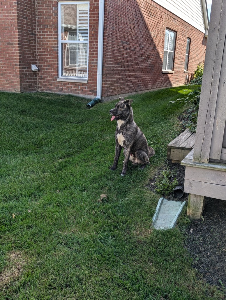 Super sweet brindled shepherd/bully mix? It’s my best guess. I think he’s been out for a few days. Pretty skinny for his size. Playful like a puppy, but still a large dog!