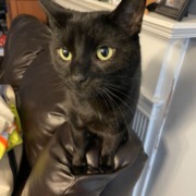 Mowgli is all black with green eyes. He’s sweet and will respond to his name and whistling. He’s an indoor/outdoor cat and loved. Please help bring him home.