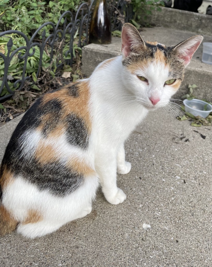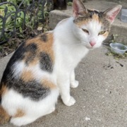 This is a calico cat that has been hanging around the apartment complex for some time. She has had kittens who are now weaned. They were taken by a neighbor that had moved, but this cat was left behind. She needs to return home or find a new loving home. She is very sweet and gentle.