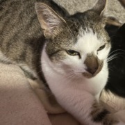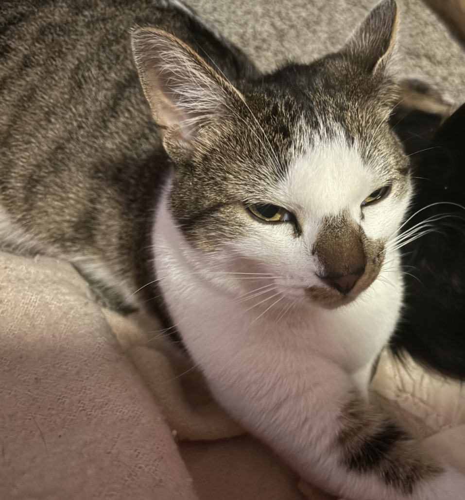 Chunky white/gray/black cat. Shy but extremely lovable.