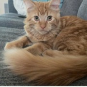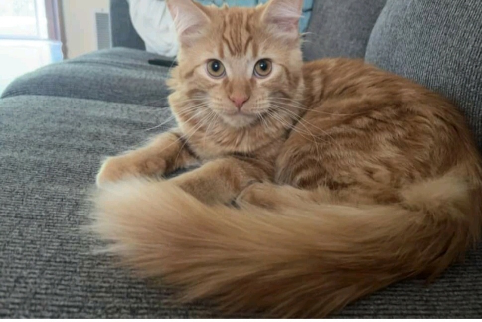 Orange male cat, fluffy tail, friendly, but used to being indoors so may be scared. Jaw may look a bit different due to having jaw surgery that includes wiring & screw fixture in the past