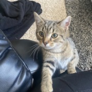 Small kitten 5 to 6 months old weighing 5 to 6 pounds found near 17th and Main in Beech Grove. Very friendly original finder was not able to keep her inside due to other cats. I have moved her to my home near the west side of Indianapolis while searching for her family she appears to be very cared for and is very friendly once you gain her trust. Because I was not the first one to find her. I am not entirely confident about the exact date and time she was found, but she has been wandering in the area for at least three days.