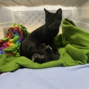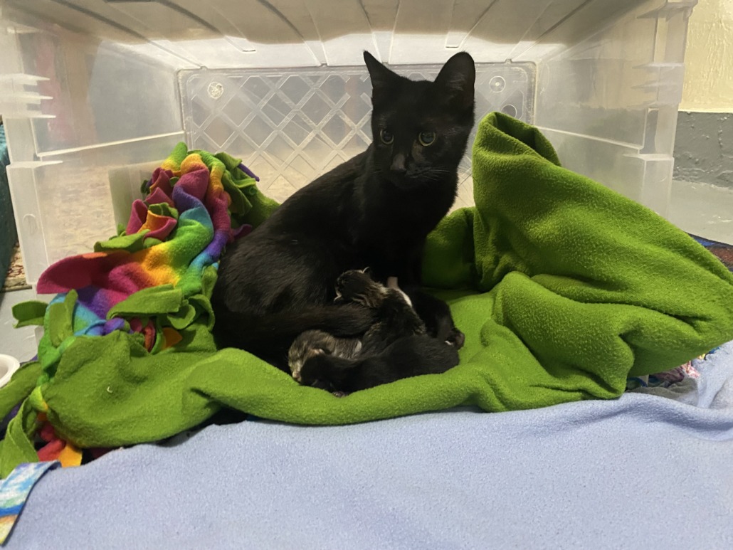 Black pregnant cat gave birth to kittens on my patio. She’s all black with a strand or two of white/grey on her back. She’s either a stray or has been lost only a few days/week. Heavily pregnant when missing possibly?