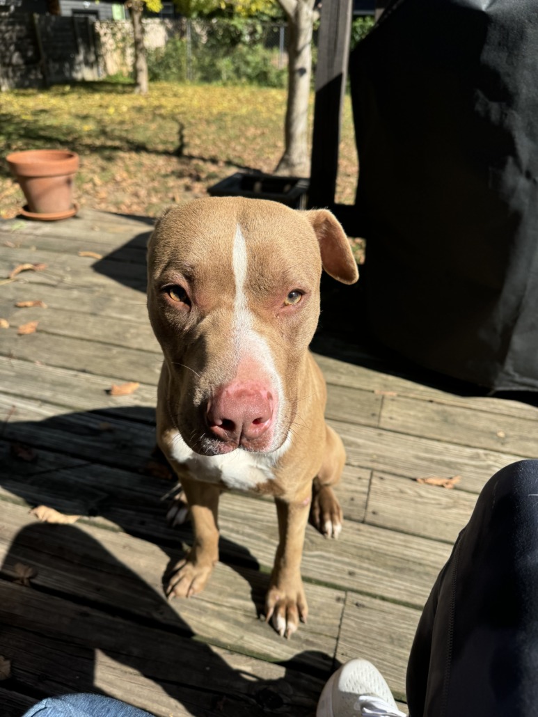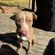 Mostly tan with white stripe down nose and a white chest. Bully type breed