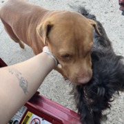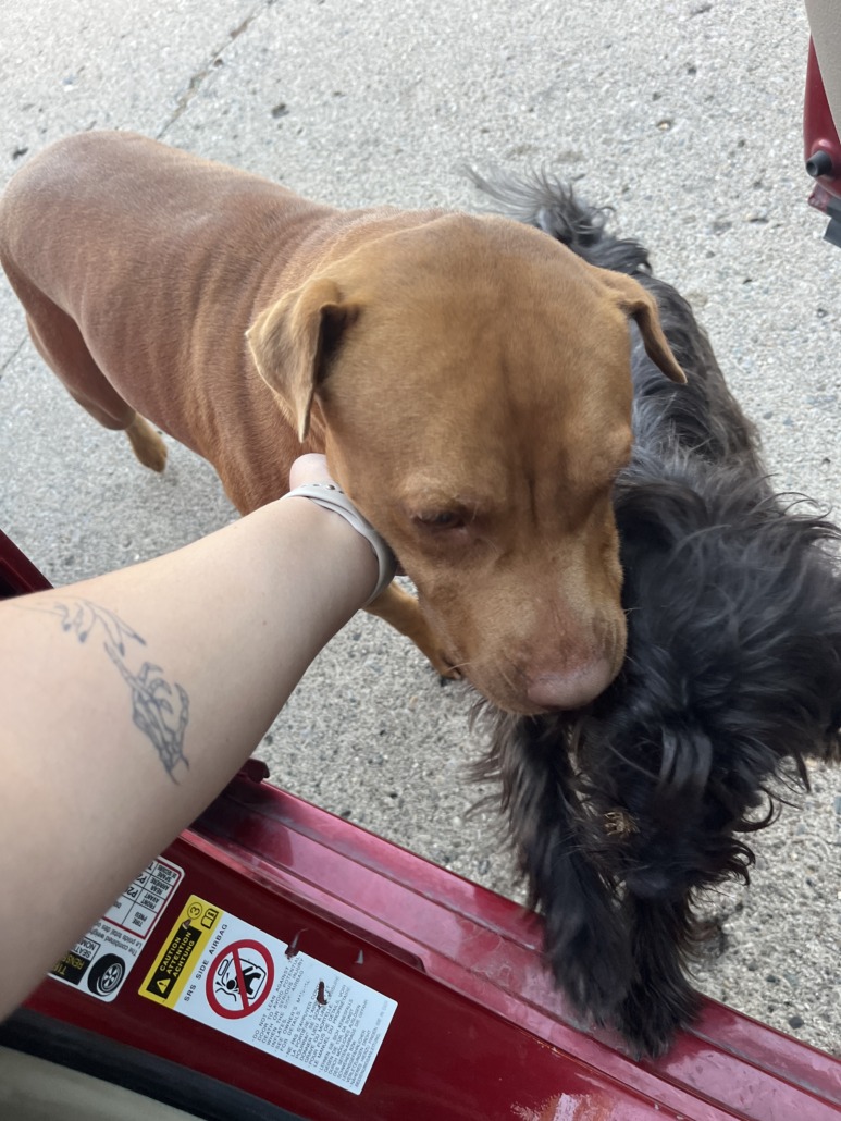 One small, black dog with long fur and one medium, brown female pit bull. Traveling together. The pit didn’t have a collar and the black dog had a collar with a keychain.