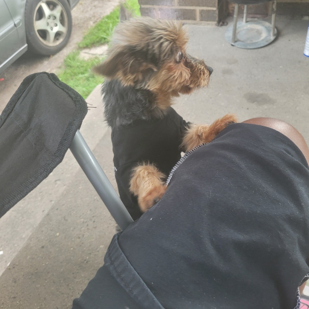 Small yorkie brown , black Grey.
