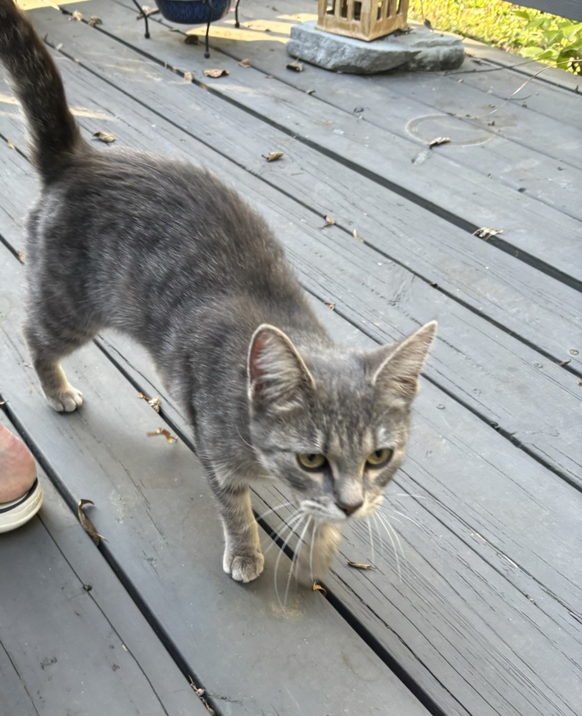 Small grey striped female cat. Black rubber collar with metal buckle.