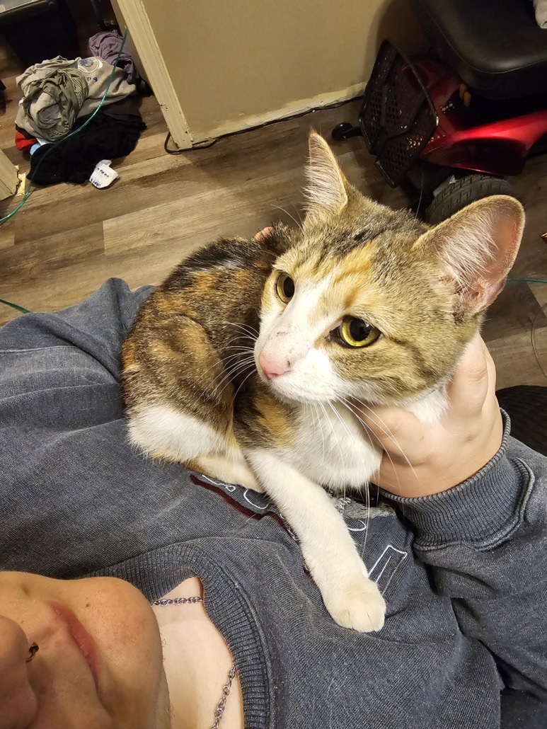 She is a calico and very friendly. Please provide pictures and documents of ownership