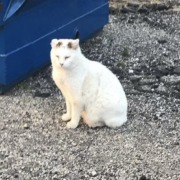 Medium to large size white cat with a tipped ear. He also has a short tail that is colored.