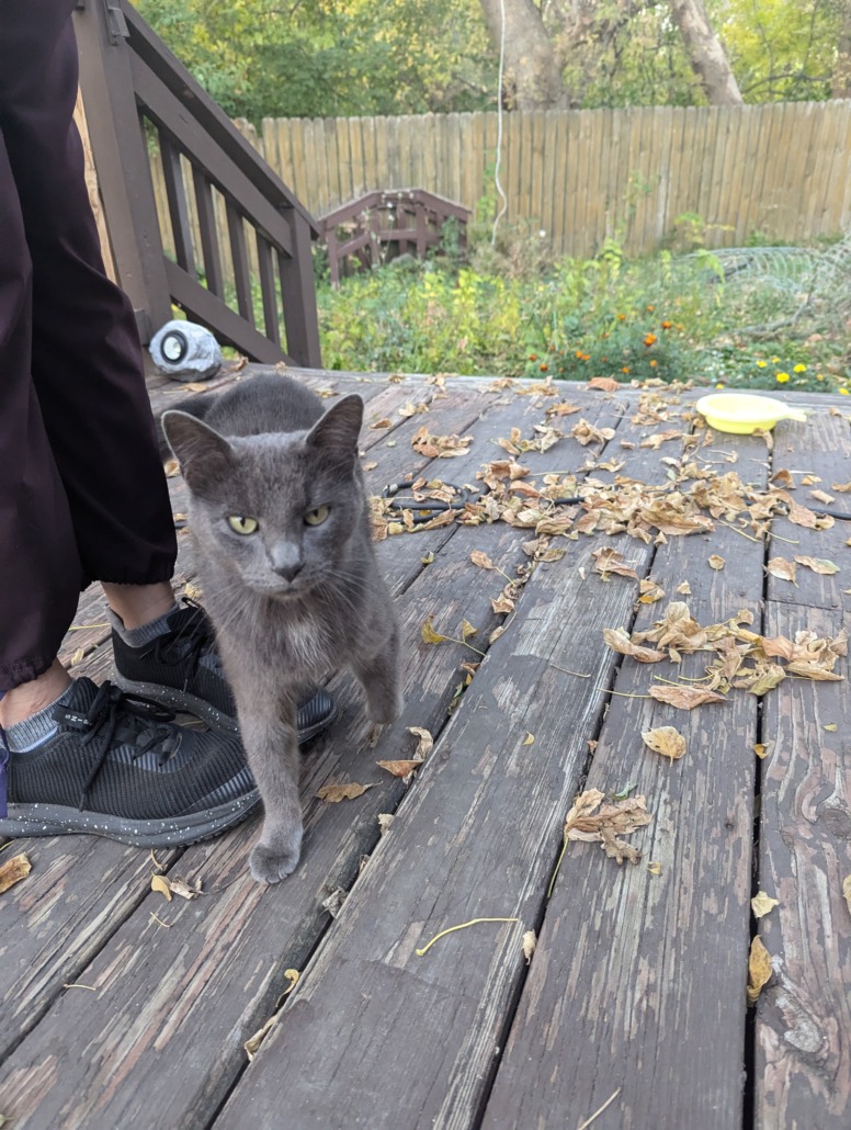 Mainly gray cat, no collar, was found just hanging out at our house. We fed it and have outdoor shelters, super friendly. Fur isn’t matted, looks clean. Proof of ownership required.