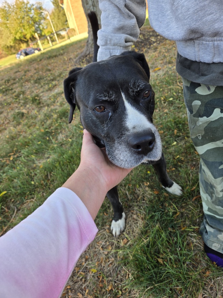 Older Male black dog with white on pausing and face with a little gray friendly very sweet. found wearing black collar, no tags. House trained nose tricks need proof of ownership.