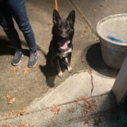 black young german shepherd mix has white on him has a blue color and a orange leash