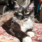 Long-hair black with white under her chin and 4 white socks.