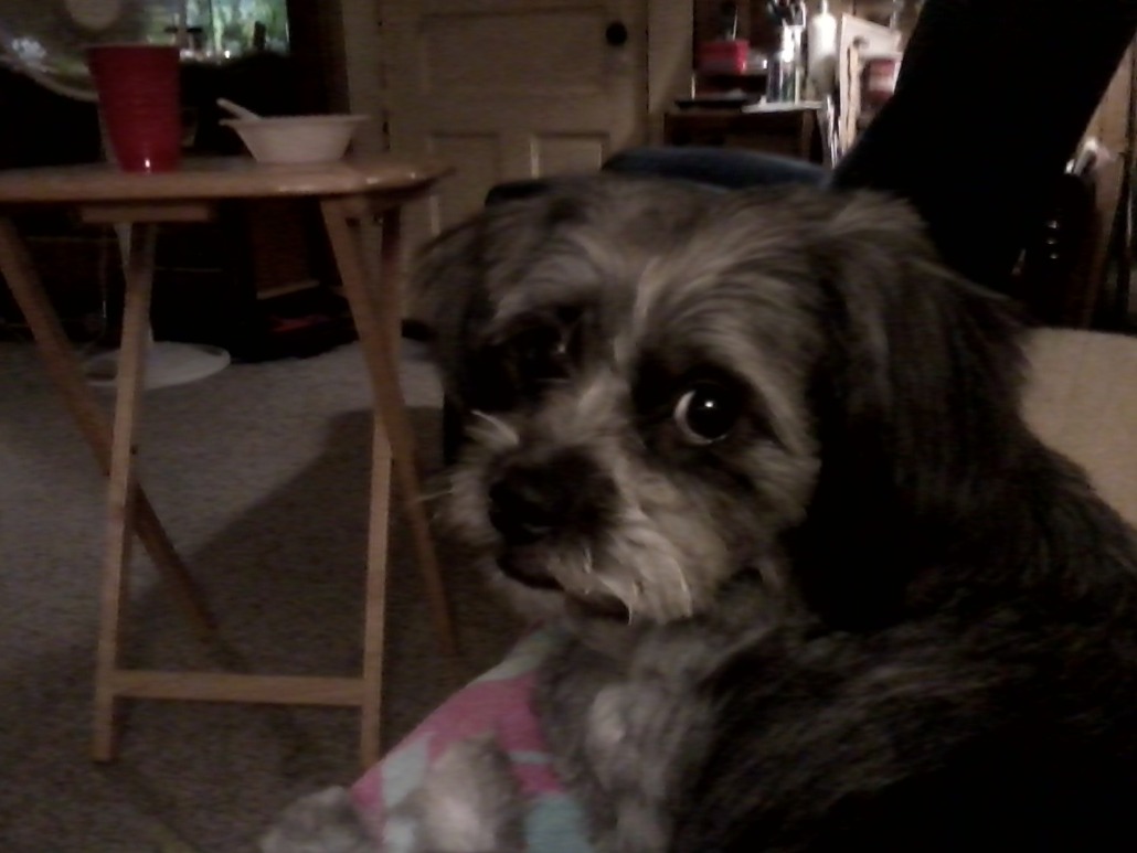 13 year old black and white Shih-Tzu. Fuzzy face and body, hair on tail is thin.
