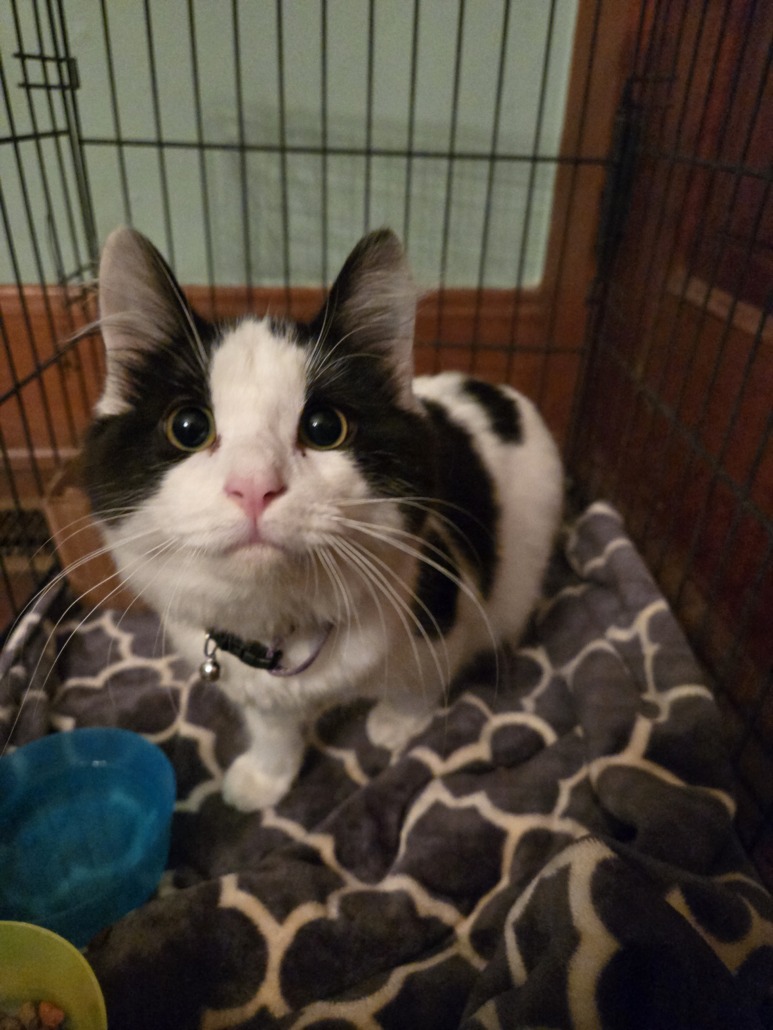 Found this white cat with black spots. Very friendly. Very fluffy and clean. Wearing collar at time she was found. Proof of ownership required.