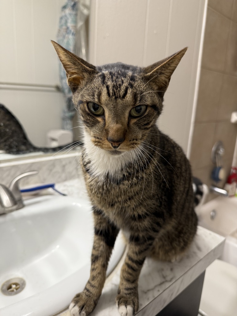 Tabby – primarily brown and black with white on her chest and feet. Friendly, lovable and calm
