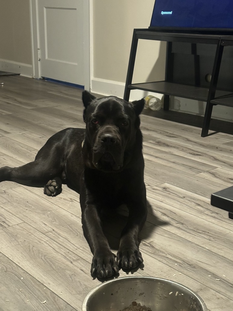 He is a all black male cane corso he had a green Kong collar on when he was lost