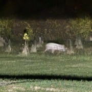 White great dane with black spots running by railroad tracks and shooting range out on five points. Ran could not get him. Almost hit him in road. Ran back into woods by shooting range.