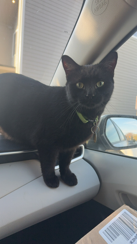 Black cat with green eyes, very friendly and loving. Super slippery and seems to like the outdoors.