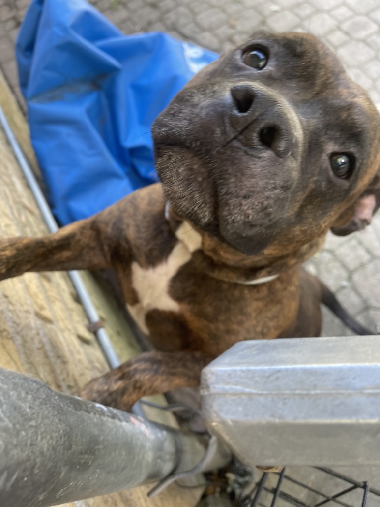 She’s a female pitbull, very sweet and friendly. Found with a collar and leash on in Farley neighborhood . She’s a brown brittle color.
