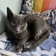 Grey kitten with soft coat. Loves to play and get chin scratches.