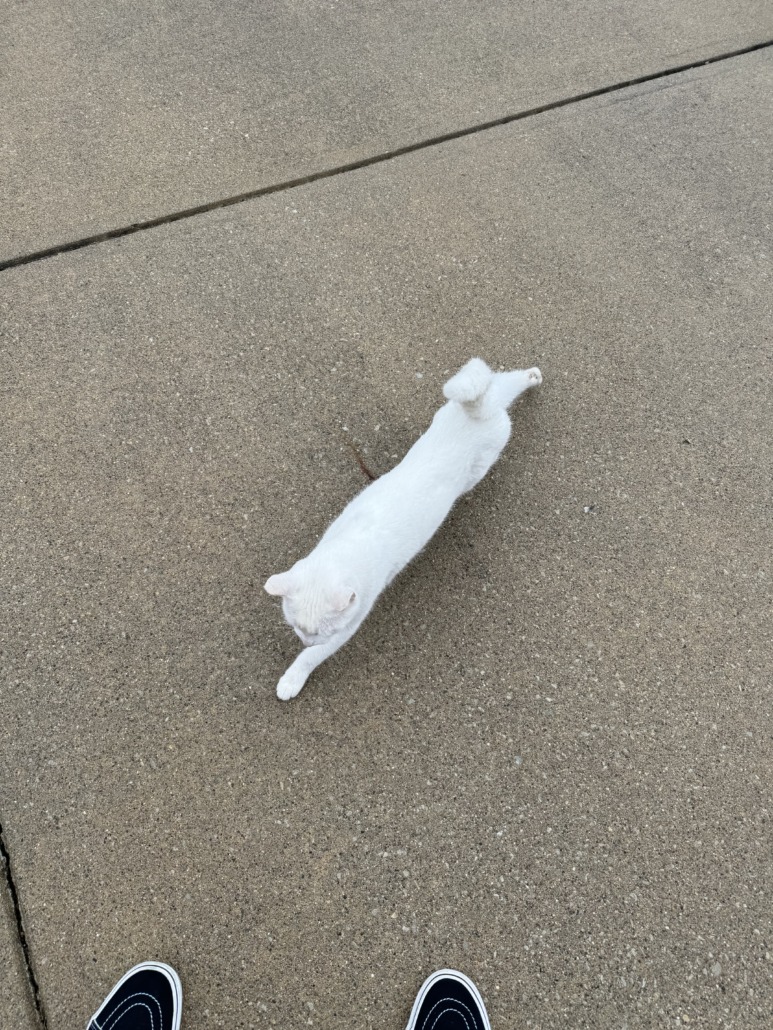 White cat. Has been hanging around our house all day.