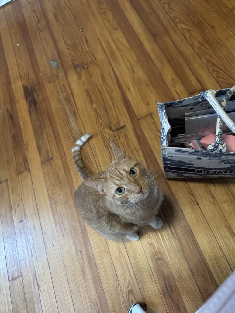 He’s a bigger orange boy who is super social and will respond to his name. he has little black freckles on his nose.