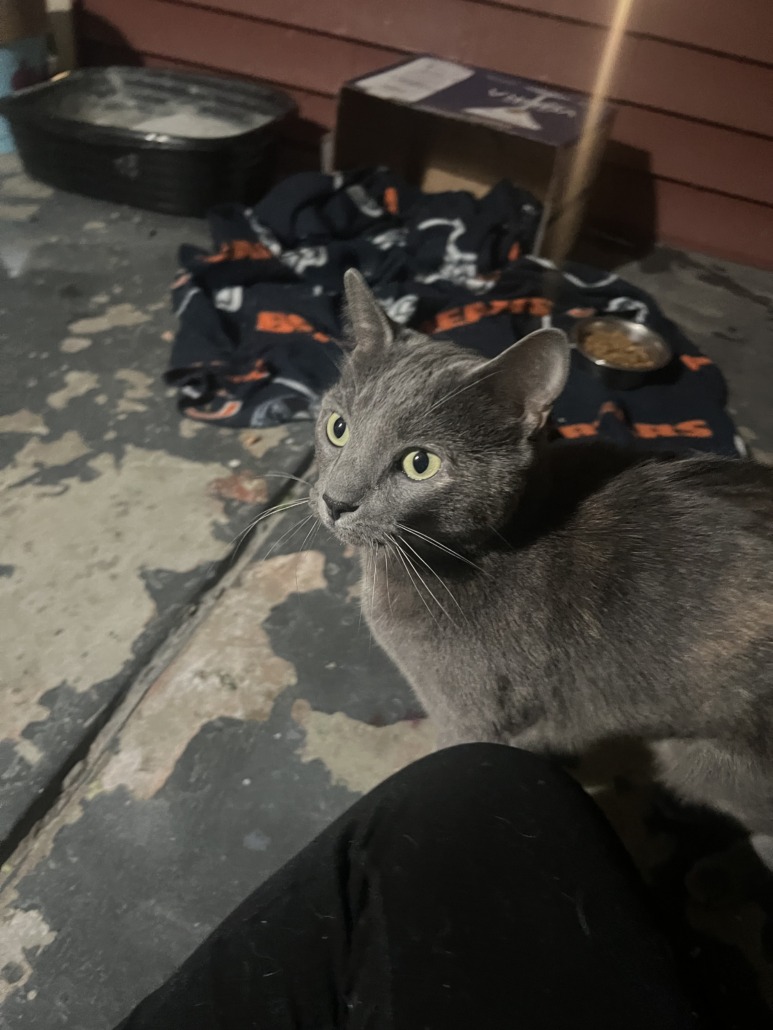 Small grey cat, has a few brown spots on there back end. Very friendly. Seems very young