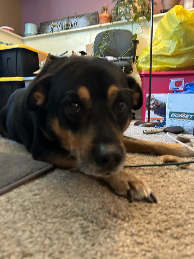 Aries is older, sweet, and very friendly. He has on a blue collar.