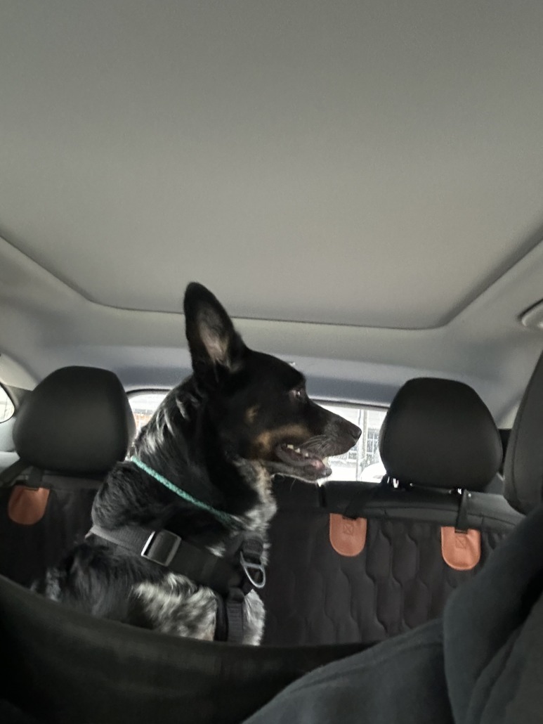 Cattle dog mix found running down the sidewalk dragging leash. Multiple cars tried to catch him. I opened my car door and he jumped right in. He is wearing a harness and leash must be able to describe both colors.