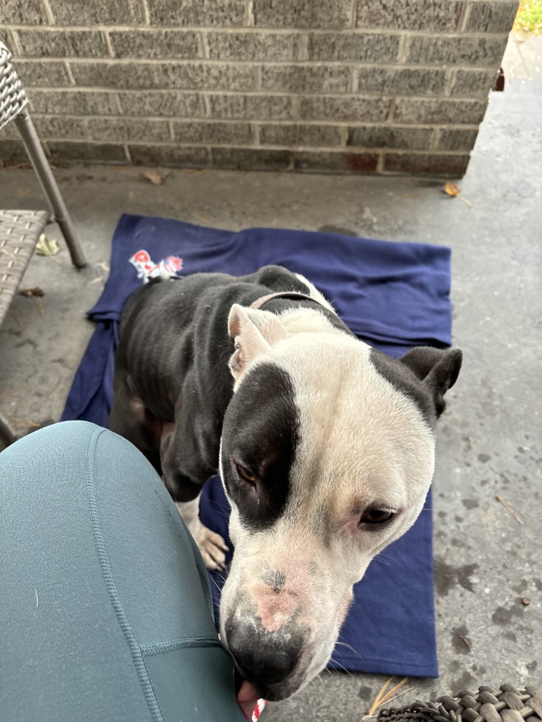 Black and white bully mix. Intact male. Appears young. Very thin but has a big head. Found near 34th and Georgetown. Proof of ownership will be required to collect.
