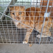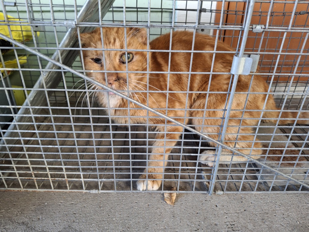 Orange cat who has injured eye, ears, and off balance. Can’t walk straight.