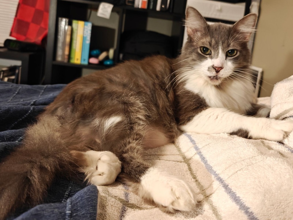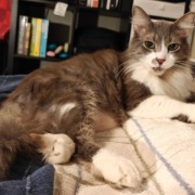 Gray and white tuxedo longhair. We found him outside under our camper. He’s friendly and affectionate, comes to see us when we call for him. Loves to be pet, and cuddles up with us and purrs. Proof of ownership is required.