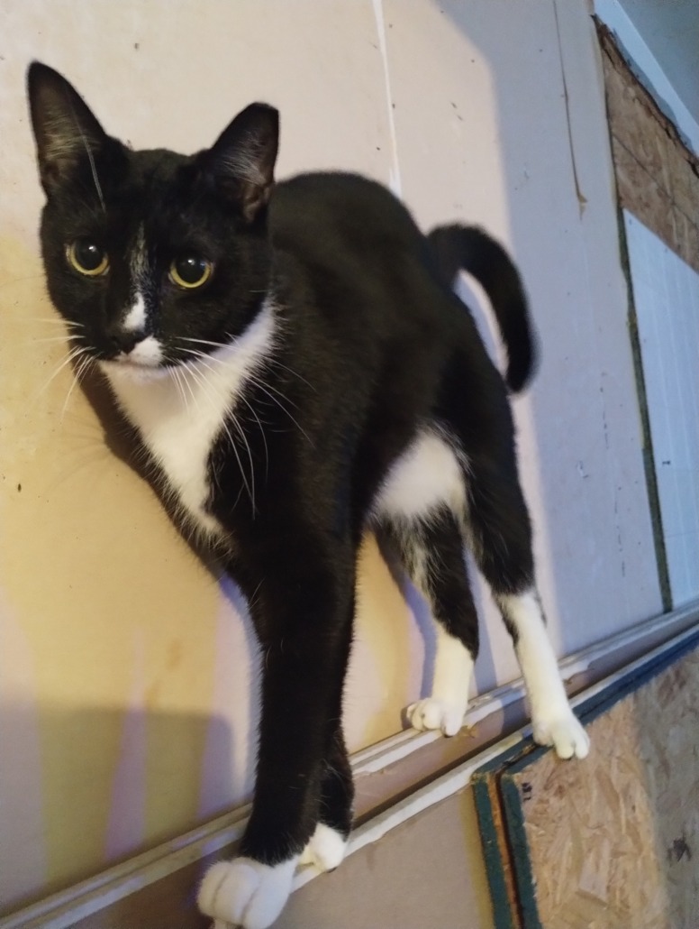 Tuxedo, socks and mittens, tipped ear, yellow-green eyes, hates chapstick (he gags at the smell) loves sleeping on canvas/backpack material.
