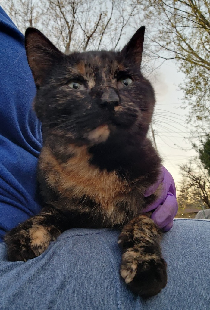 Sm to med tortie cat, seems friendly, very hungry.