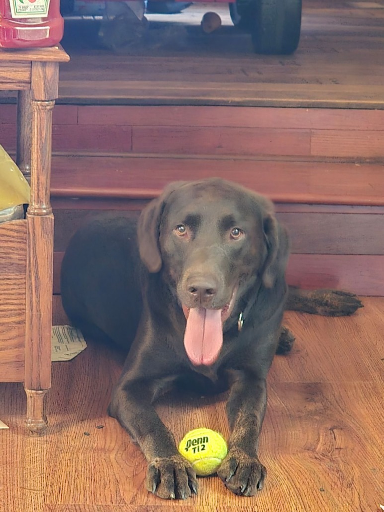 Chocolate lab, 2 years old, black collar.
