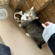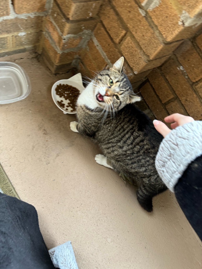 Tabby with white chest & paws. She has a tipped left ear and a shorter tail. She is very friendly and allowed me to pet her immediately.
