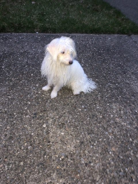 Small white dog with a red collar with chip information on it.