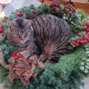Ringo’s a Tiger cat (tabby). Grey & black stripes with white & brown highlights.