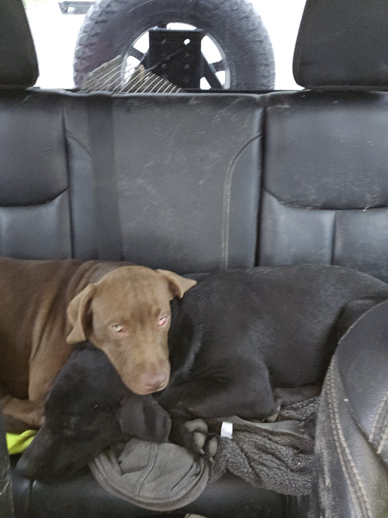 Two male lab puppies found. One all tan and one all black with white spot on chest . Age around 6months old